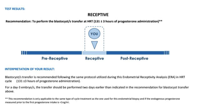 The results can come back as pre-receptive, receptive or post- receptive. If the test comes back receptive the same protocol should be used for the embryo transfer. If the test comes back non-receptive (pre or post) the timing of the embryo transfer should be adjusted accordingly