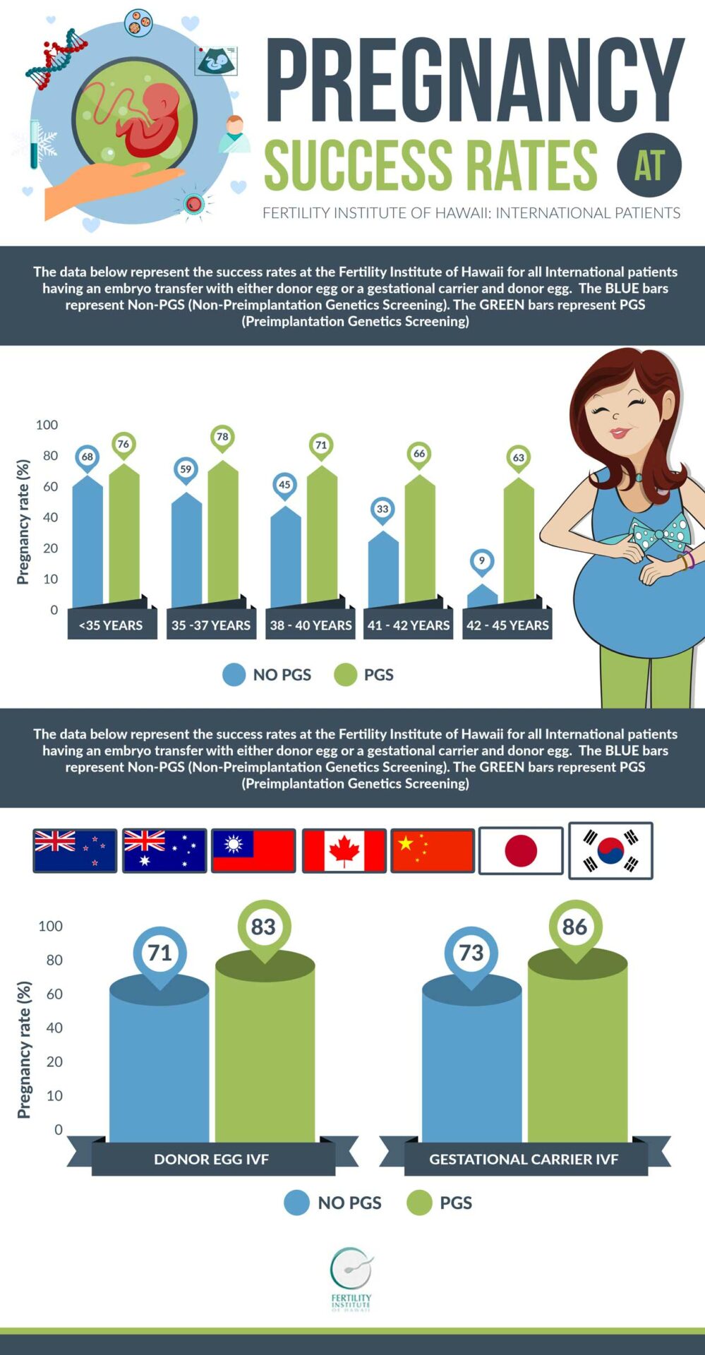The Fertility Institute of Hawaii provides advanced state-of-the-art fertility treatments to our international patients in the Pacific, Australia, New Zealand, Asia, Canada, South America, Europe, Africa, and elsewhere. As the premier IVF clinic in Hawaii and the Pacific, the Fertility Institute of Hawaii is world-renowned and offers all fertility services with some of the best pregnancy rates in the world.
