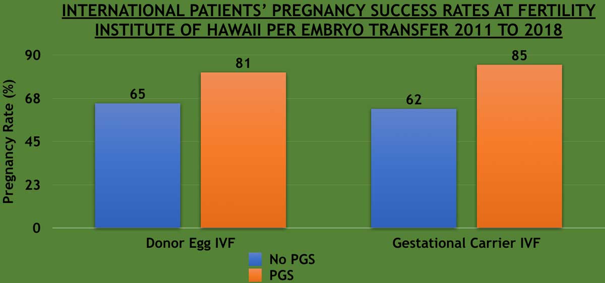 The data above represent the success rates at the Fertility Institute of Hawaii for all International patients having an embryo transfer with either donor egg or a gestational carrier and donor egg. The BLUE bars represent Non-PGS (Non-Preimplantation Genetics Screening). The ORANGE bars represent PGS (Preimplantation Genetics Screening).