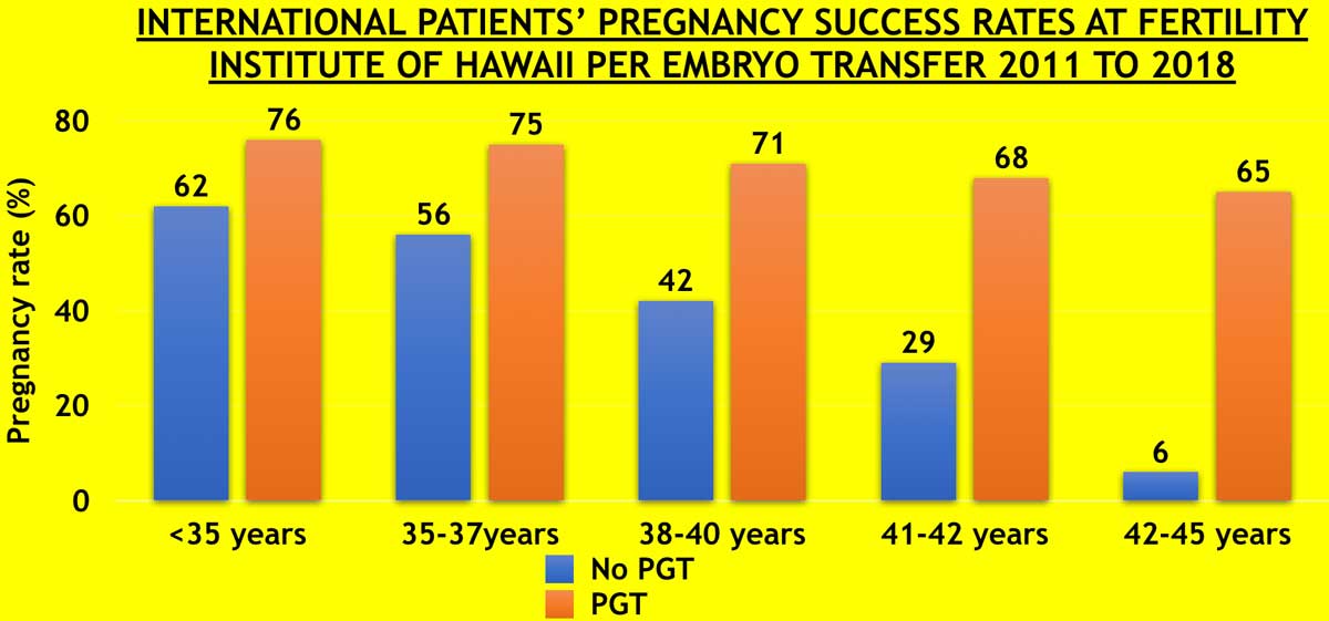 The data above represent the success rates at different ages at the Fertility Institute of Hawaii for all International Patients using autologous eggs. The BLUE bars represent Non-PGS (Non-Preimplantation Genetics Screening). The ORANGE bars represent PGS (Preimplantation Genetics Screening).