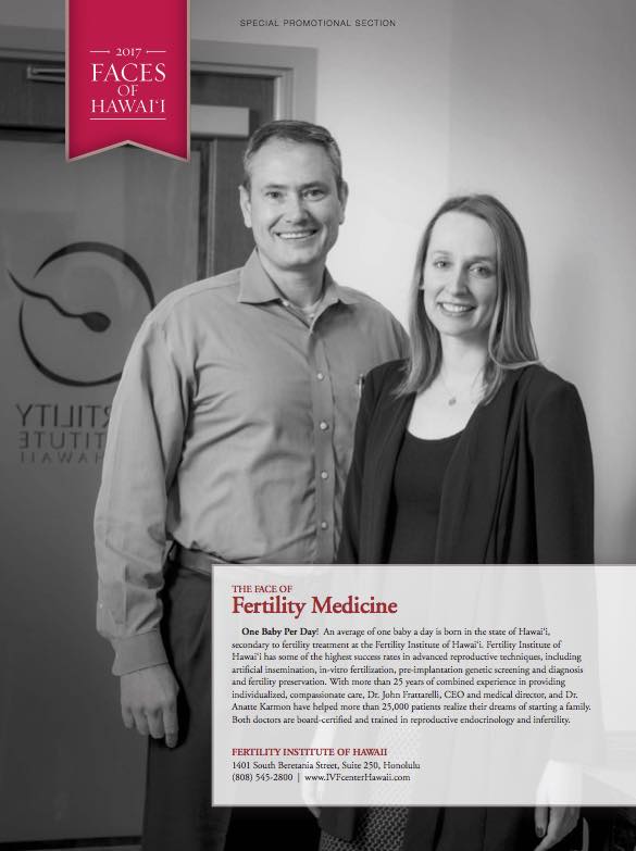 Dr. John Frattarelli and Dr. Anatte Karmon were selected as the 2017 Face of Fertility Medicine, in a special edition of Honolulu Magazine. The black and white photo essay section recognizes prominent Hawaii leaders and businesses each year in April. The Fertility Institute of Hawaii is honored to have received this recognition as experts in the field for the past four years.