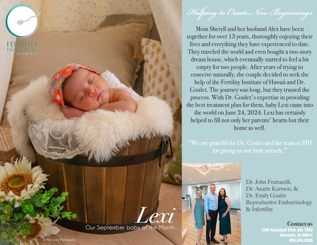 Mom Sheryll and her husband Alex have been together for over 13 years, thoroughly enjoying their lives and everything they have experienced to date. They traveled the world and even bought a two-story dream house, which eventually started to feel a bit empty for two people. After years of trying to conceive naturally, the couple decided to seek the help of the Fertility Institute of Hawaii and Dr. Goulet. The journey was long, but they trusted the process. With Dr. Goulet’s expertise in providing the best treatment plan for them, baby Lexi came into the world on June 24, 2024. Lexi has certainly helped to fill not only her parents’ hearts but their home as well